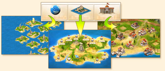 You can change the view in iZariam as you like. From the world view over the island maps to the town view.